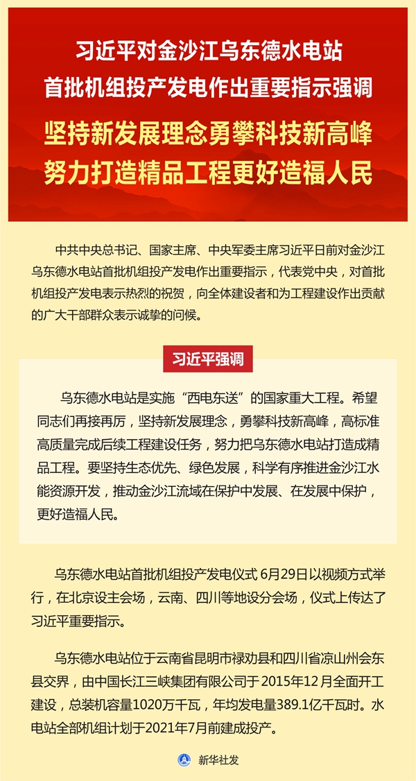 新華社北京6月29日電 中共中央總書記、國家主席、中央軍委主席習近平日前對金沙江烏東德水電站首批機組投產(chǎn)發(fā)電作出重要指示,代表黨中央,對首批機組投產(chǎn)發(fā)電表示熱烈的祝賀,向全體建設(shè)者和為工程建設(shè)作出貢獻的廣大干部群眾表示誠摯的問候。 習近平強調(diào),烏東德水電站是實施“西電東送”的國家重大工程。希望同志們再接再厲,堅持新發(fā)展理念,勇攀科技新高峰,高標準高質(zhì)量完成后續(xù)工程建設(shè)任務(wù),努力把烏東德水電站打造成精品工程。要堅持生態(tài)優(yōu)先、綠色發(fā)展,科學(xué)有序推進金沙江水能資源開發(fā),推動金沙江流域在保護中發(fā)展、在發(fā)展中保護,更好造福人民。 烏東德水電站首批機組投產(chǎn)發(fā)電儀式29日以視頻方式舉行,在北京設(shè)主會場,云南、四川等地設(shè)分會場,儀式上傳達了習近平重要指示。 烏東德水電站位于云南省昆明市祿勸縣和四川省涼山州會東縣交界,由中國長江三峽集團有限公司于2015年12月全面開工建設(shè),總裝機容量1020萬千瓦,年均發(fā)電量389.1億千瓦時。水電站全部機組計劃于2021年7月前建成投產(chǎn)。
