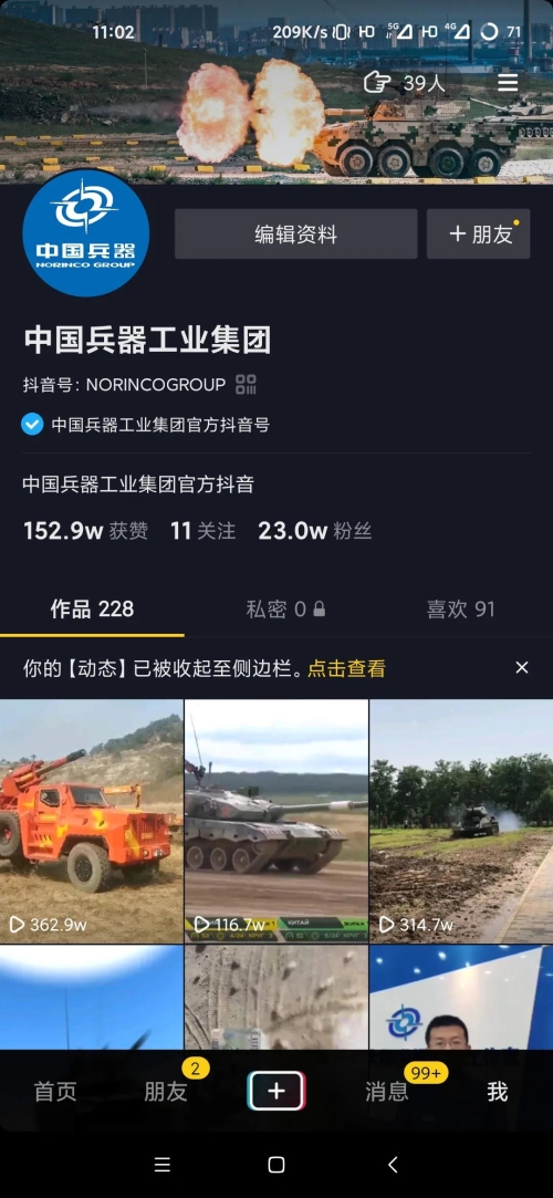 近日 中國兵器工業(yè)集團抖音號 喜獲殊榮 成為2020年政務抖音號 優(yōu)秀創(chuàng)作者 2020年1月 集團公司抖音號正式開通 近1年來,短視頻宣傳取得良好效果 截至目前,共發(fā)布視頻228個 總粉絲數(shù)23萬,獲贊152萬 播放總量已超8000萬 |