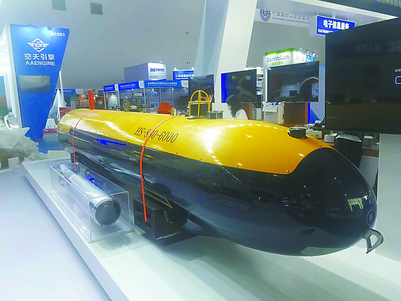 相比公眾相對熟悉的無人機和無人車,無人船和無人潛航器的知名度略低,但本屆珠海航展上展出的相關裝備具備相當高的水平。例如HS-880-6000型自主式水下航行器(AUV)就是國內首型搜救型無人潛航器。它的最大工作深度達6000米,能以3節(jié)的速度連續(xù)航行24小時,配備有深水遇險目標高分辨低照度照明系統(tǒng)、聲信標定向引導聲吶、水聲探測側掃聲吶等,具備工作水深范圍寬、載荷能力大、續(xù)航力長、搜尋探測能力強等特點,可對深海目標全自主精細搜尋、探測、定位,執(zhí)行深海水下目標搜尋探測和海洋科學研究任務。另一款“守望者”無人潛航器個頭小巧,配備有光學探頭、戰(zhàn)斗部和通信設備,可以自動靠近水中或海底目標進行觀測、毀傷目標,用于執(zhí)行反水雷、排障、海底管道巡檢等任務。
