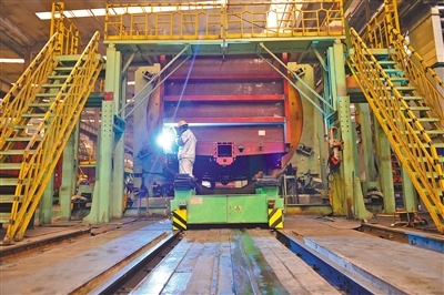 中國兵器工業(yè)集團一機集團北方創(chuàng)業(yè)公司生產(chǎn)線開足馬力生產(chǎn)鐵路車輛產(chǎn)品。日前,為圓滿完成1200臺C70E(H)型通用敞車生產(chǎn)任務,該公司不斷創(chuàng)新生產(chǎn)組織模式,新、舊兩條生產(chǎn)線全面啟動,白、夜班雙班組織生產(chǎn),有效保障生產(chǎn)進度。(王磊 攝) |