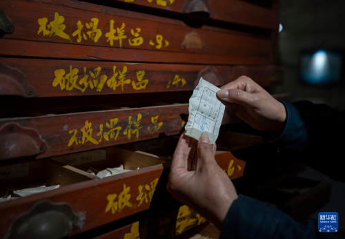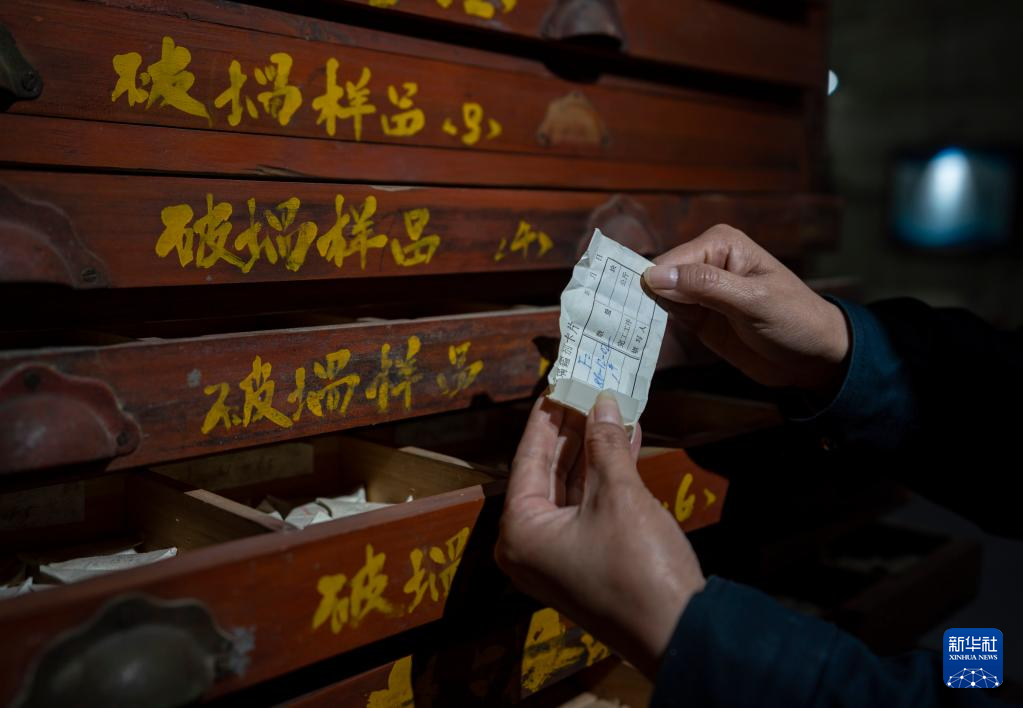 5月16日,工作人員在展示玻璃樣品柜內(nèi)的一個(gè)玻璃樣品。