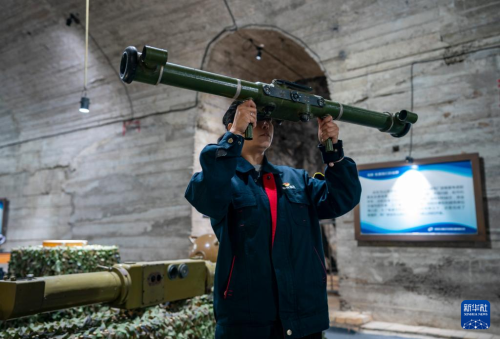 5月16日,一名工作人員在中國(guó)光學(xué)歷史博物館內(nèi)展示對(duì)空測(cè)距機(jī)使用方法。