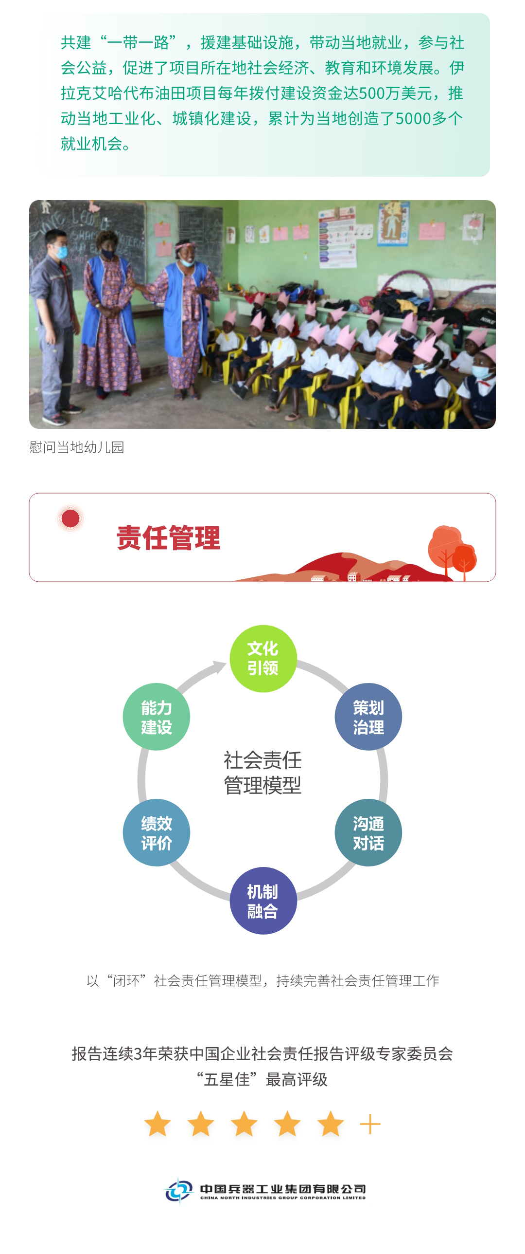 近日,兵器工業(yè)集團(tuán)正式發(fā)布第十三份年度社會責(zé)任報告——《中國兵器工業(yè)集團(tuán)有限公司2021年社會責(zé)任報告》,以“用心守護(hù)和平、用力爭創(chuàng)一流、用情溫暖社會”為主題,從恪守強(qiáng)軍首責(zé)、服務(wù)經(jīng)濟(jì)建設(shè)、共創(chuàng)美好生活三個維度,向社會全面披露2021年度履責(zé)實踐和履責(zé)業(yè)績?!秷蟾妗愤B續(xù)第三年獲得中國企業(yè)社會責(zé)任報告評級專家委員會“五星佳”評級,兵器工業(yè)集團(tuán)成為軍工行業(yè)唯一連續(xù)11年獲得五星及五星佳最高評級的企業(yè)。 一圖解碼兵器工業(yè)的“責(zé)任力量” |