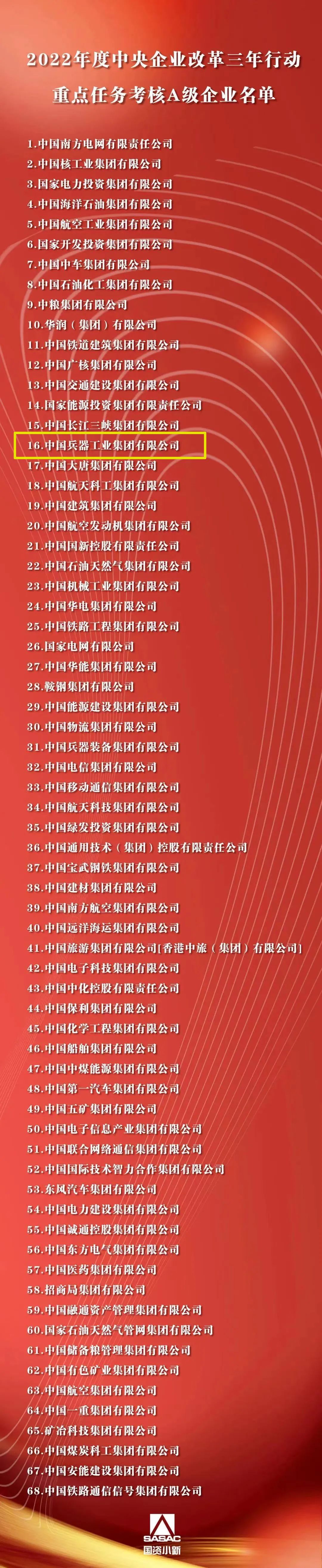 根據(jù)《中央企業(yè)改革三年行動重點任務考核實施方案(試行)》和《中央企業(yè)改革三年行動重點任務考核指標表(2022版)》,經(jīng)審定,國務院國資委發(fā)布2022年度中央企業(yè)改革三年行動重點任務考核A級企業(yè)名單,中國兵器工業(yè)集團有限公司獲評A級。 來源/國資委網(wǎng)站 |
