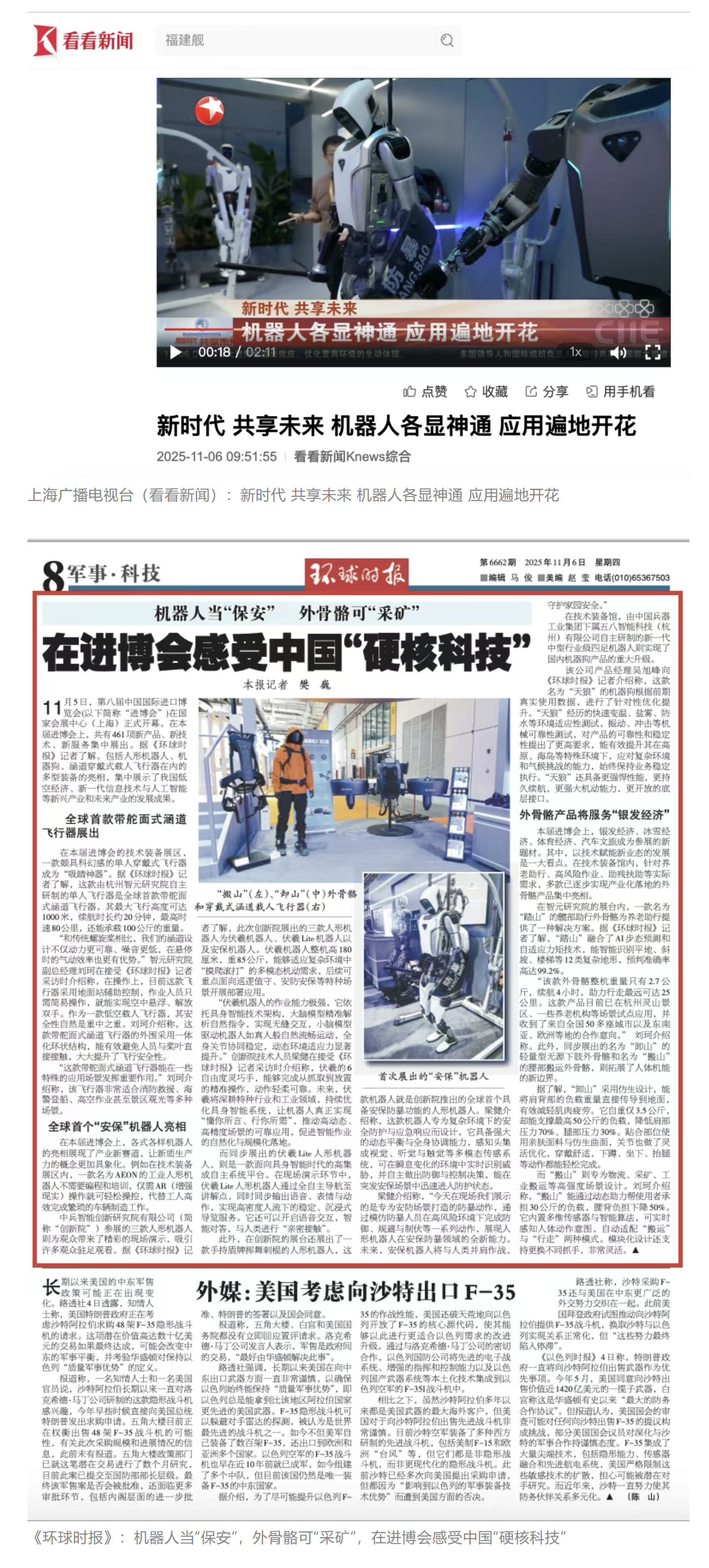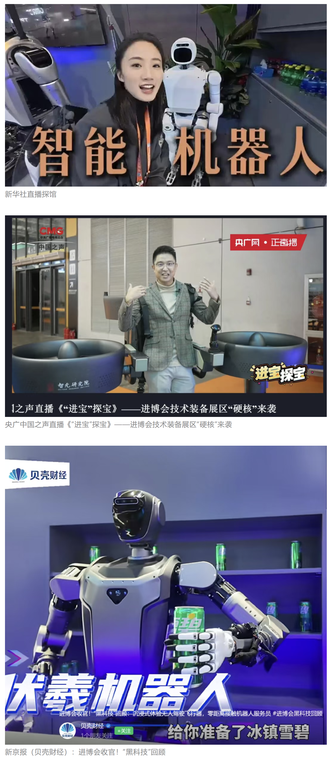 《環(huán)球時報》、環(huán)球網(wǎng)、《新京報》、《中國旅游報》等對集團公司人形機器人、四足機器人、涵道穿戴式載人飛行器、外骨骼等多型新域新質(zhì)產(chǎn)品,集中亮相進行報道。新華社、央廣中國之聲、新京報(貝殼財經(jīng))、上海廣播電視臺等媒體直播探館,打卡兵器“硬核科技”。